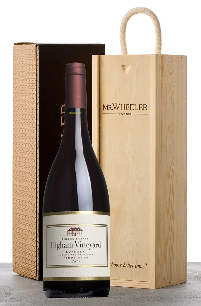 A single bottle of Pinot Noir from Higham Vineyards in Suffolk, presented in a beautiful wooden gift box.