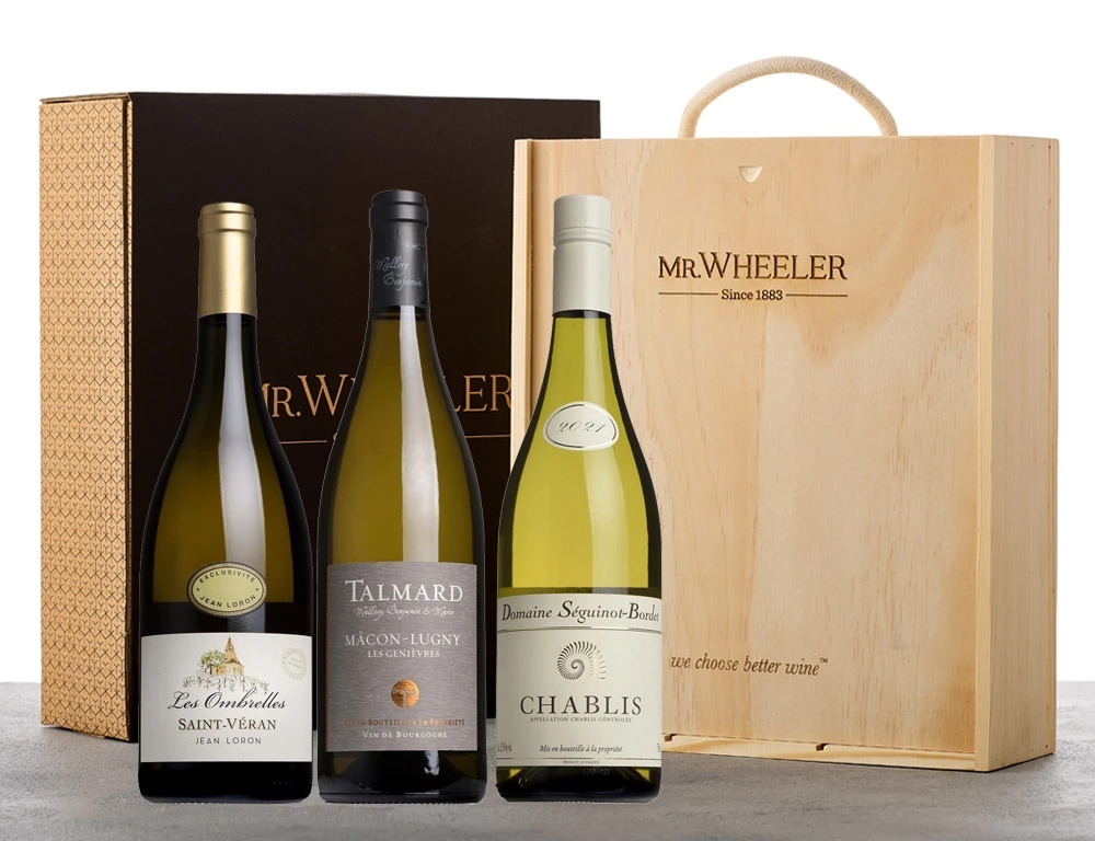 A three bottle selection of white Burgundy presented in a wooden gift box.