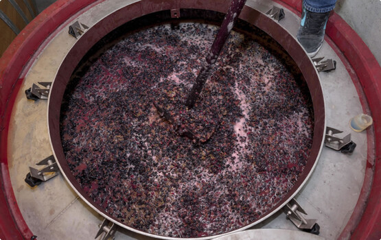 - Crushing and Fermentation: After harvest, the grapes are sorted, destemmed and crushed to release their juice while keeping the skins and seeds intact. These skins are crucial, as they contain pigments, tannins, and compounds that provide red wine with its structure and colour. For less tannic grapes such as pinot noir, producers may include ripe stems in the mix for added support.