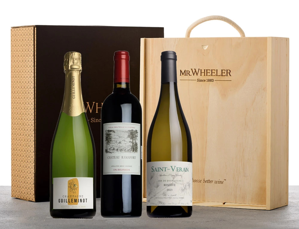 Grower champagne, white Burgundy, top-vintage Médoc in a single gift box.