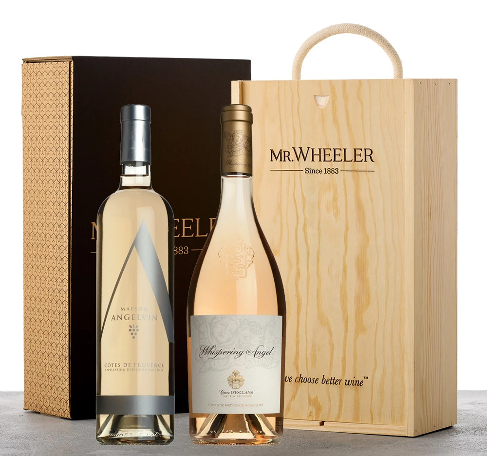 A two bottle selection of rosé wine from Provence, presented in a Mr.Wheeler wooden gift box.